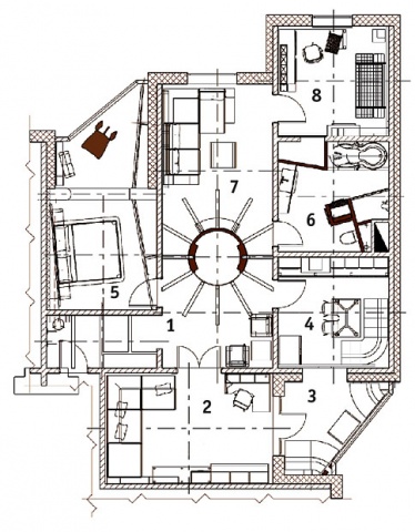 В циничной гонке за «банальным материальным…» каждый из нас под вечер вспоминает о себе как о личности и вдруг гдето на дне души обнаруживает остатки внутреннего мира… И вдруг понимает, что не остатки это вовсе, а смысл его жизни. И остается лишь пульсирующая жажда бежать, уносить свою душу от всего тленного в другое, одухотворенное пространство. Подобно ежедневным метаморфозам сознания, мы стремимся обеспечить себя местом, где все будет иначе, нежели в неизбежном несовершенстве бытия… Атмосфера малознакомых нам культур призвана увлекать, наполнять, завораживать… Обволакивая ею тщательно продуманную эргономику данных нам квадратных метров, мы в разы сокращаем путь к вожделеному оазису душевного уюта. А, может быть, и точно попадаем в то место, как знать… Логика построения жилого пространства минималистская — рациональное использование площади. Перепланировка не имела глобального характера, за исключением переноса нескольких дверных проемов в несущих стенах и объединения спальни и балкона в одно пространство. Акцентным решением является деление длинной узкой комнаты на два объема: небольшой холл и лаунжзону посредством авторского прочтения африканского растения — зонтичной акации — цилиндрического шкафакупе. Стилизация — наследие культур народов Африки. Здесь авторы не брезговали ни прямыми цитатами (картины, описывающие быт африканцев, зебрано, венге, ротанг и пр.), ни авторским прочтением — «зебровый декор стен», стилизация шкафакупе под зонтичную акацию, геометрия и колористика помещений и прочее.