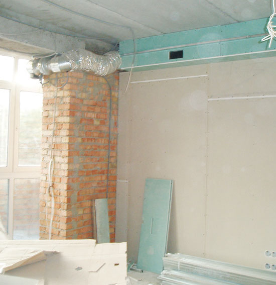 При прокладке вентиляционных каналов и устройстве воздуховодов после начала строительства, но ещё до выполнения ремонтных работ, нередко прибегают к использованию дополнительных отделочных материалов и конструкций, используя гипсокартон, штукатурку, подвесные потолки и т.д.