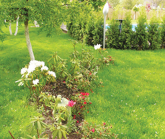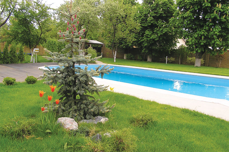 Ландшафтная структура приусадебного участка, сложная в обилии приемов садоводства, смещается в сторону спокойного европейского стиля. Ландшафт формируют дорожки, вымощенные брусчаткой и плитняком, по которым можно добраться до различных зон небольшого парка: садовой, прогулочной, зоны отдыха с небольшой беседкой вдалеке от бассейна.